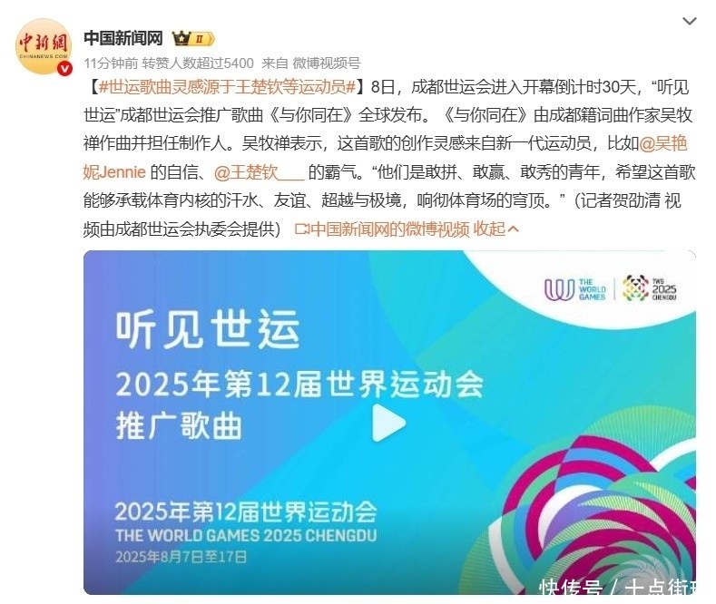 “这首歌的创作灵感来自于新一代运动员,他们是敢拼、敢赢、敢秀的青年。”吴牧禅在歌曲发布会上如是说,作为曾创作《烟火成都》《我心归处》等“城市情书”的音乐人,此次他将王楚钦等运动员展现的体育精神内核,汗水、友谊、超越与极境,熔铸进跃动的音符中,歌曲中反复咏唱的“与你同在”四个字,既是对全球来宾的深情邀约,也是对拼搏者之间心灵共鸣的精准诠释